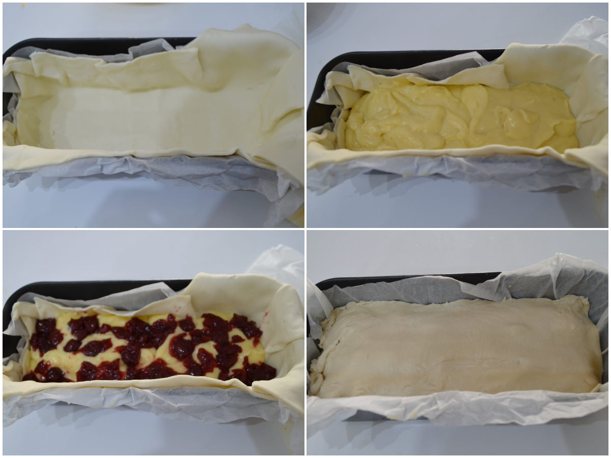 Componete quindi il dolce: usate il primo foglio di pasta sfoglia per foderare il fondo e i bordi dello stampo rivestito di carta forno.
