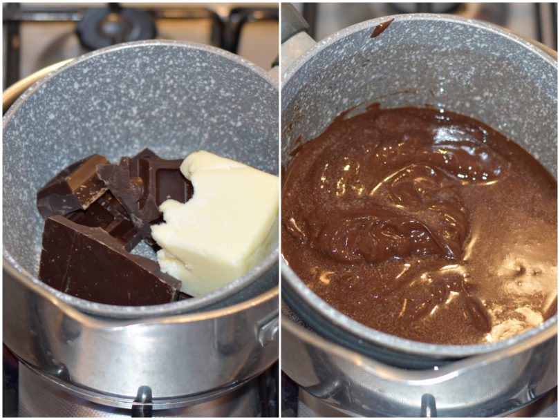 Spezzettate il cioccolato e scioglietelo insieme al burro a bagnomaria o in microonde, quindi lasciatelo intiepidire leggermente.