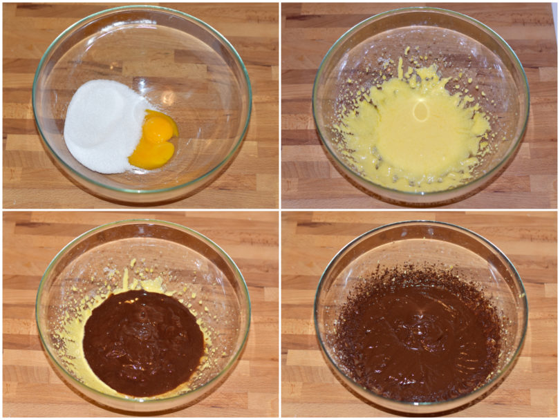 Montate molto bene i tuorli con i 100 gr restanti di zucchero, poi incorporate il cioccolato ormai tiepido continuando a montare.