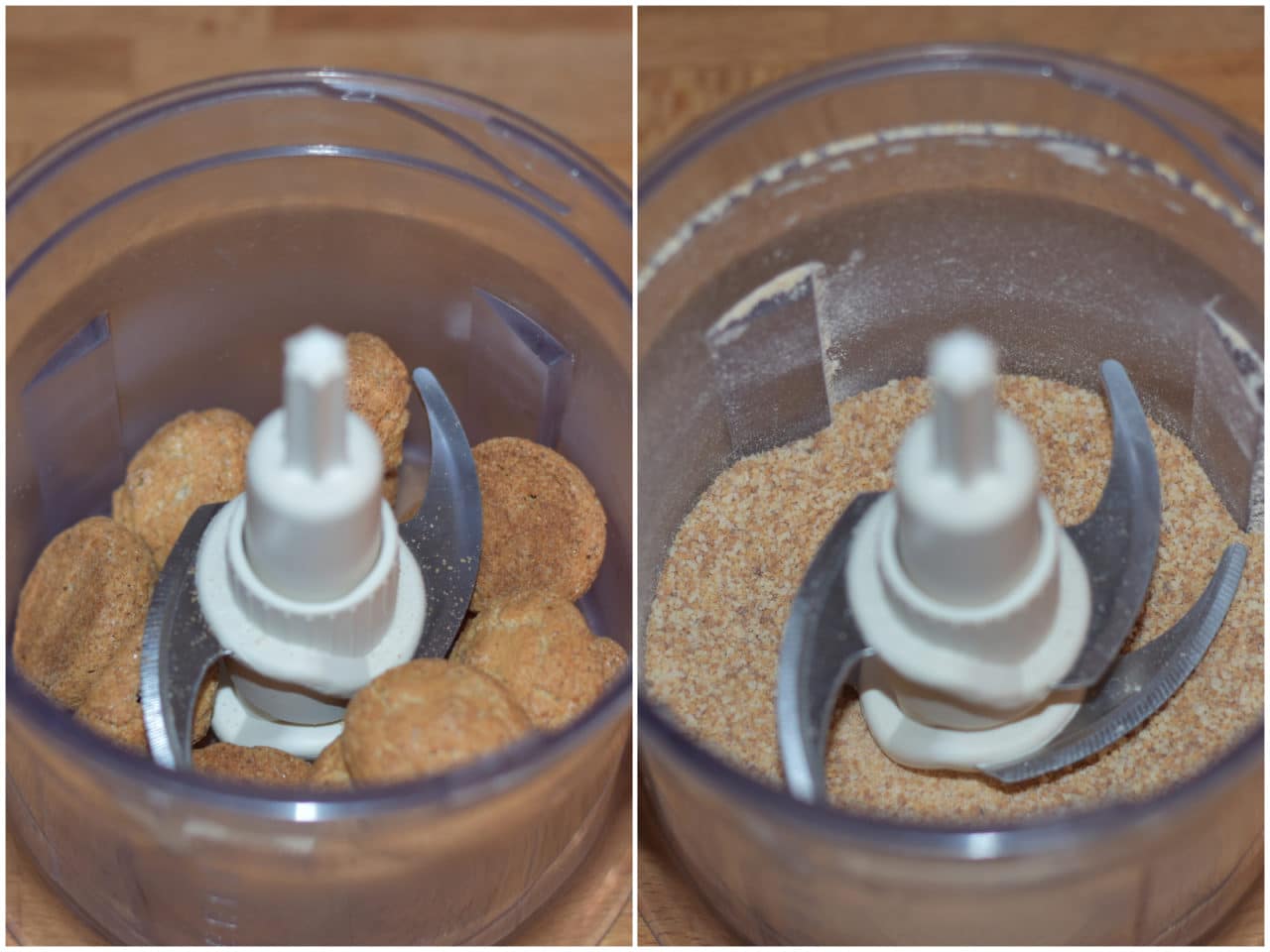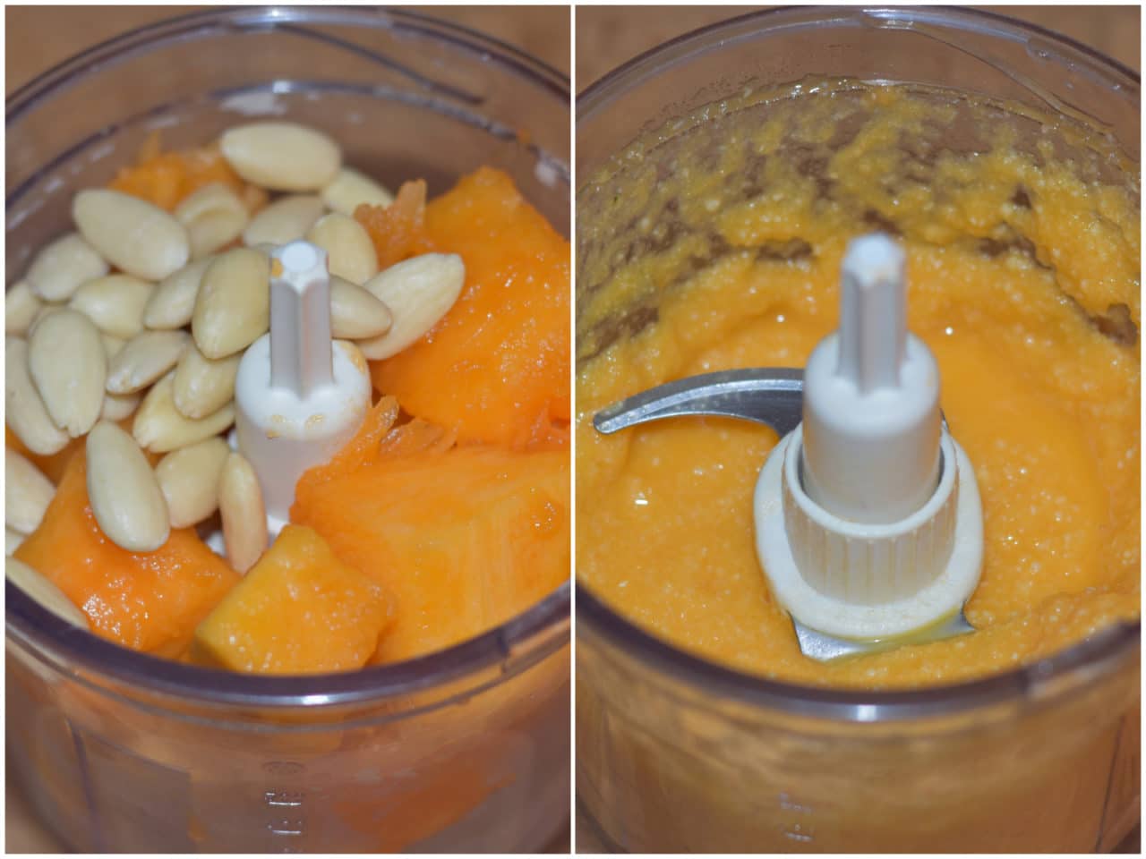Innanzitutto frullate finemente gli amaretti con un mixer, quindi metteteli da parte e, con lo stesso mixer, frullate insieme zucca pulita e mandorle.