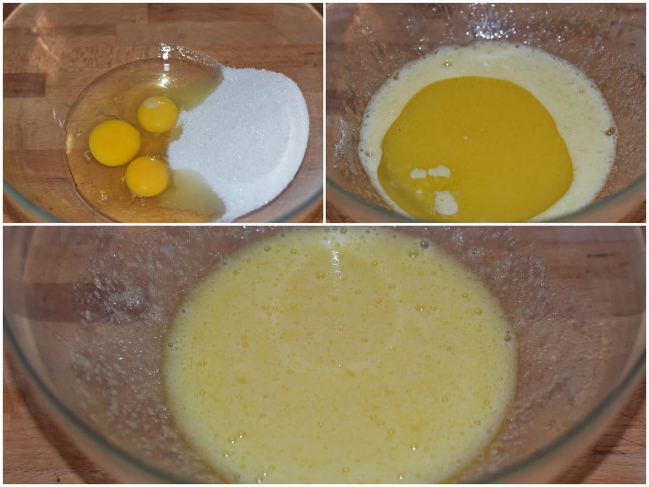 In una ciotola sbattete bene le uova con lo zucchero fino a renderle gonfie e spumose. Poi unite l'olio e mescolate.
