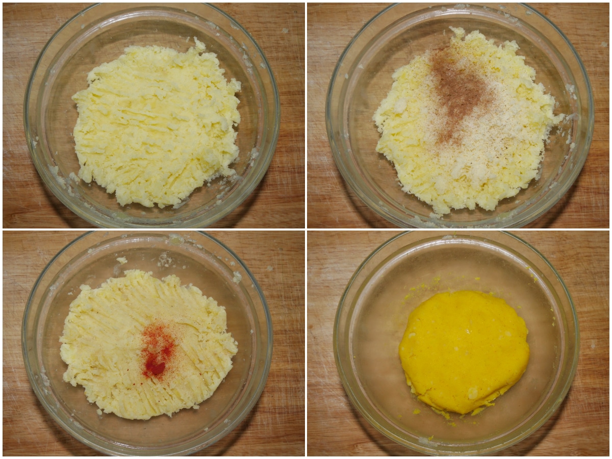 Schiacciate la patata e aggiungete sale, pepe, noce moscata, grana e zafferano, amalgamando fino ad ottenere un composto uniforme.