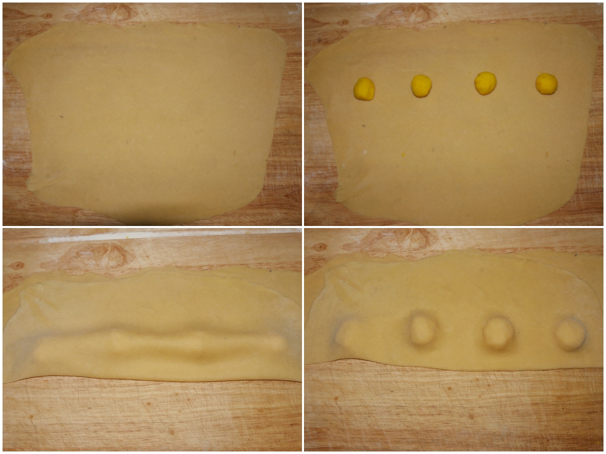 Disponete la farcitura a intervalli regolari sulla sfoglia, quindi ripiegatela su se stessa per coprire la farcitura e passate le dita intorno al ripieno per far uscire le bolle d'aria.
