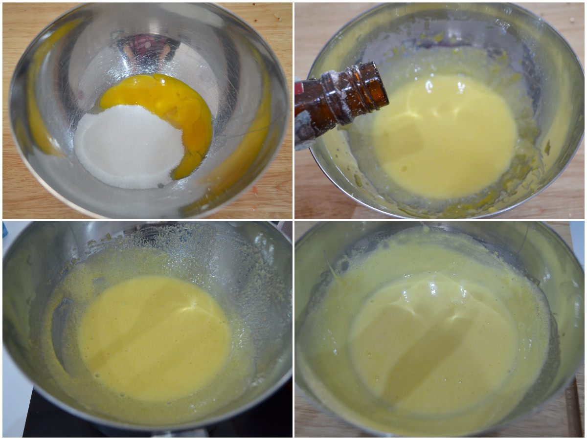 Innanzitutto preparate lo zabaione: sbattete le uova con lo zucchero (in un recipiente adatto per la cottura a bagnomaria) fino ad ottenere un composto chiaro e spumoso, quindi incorporate il liquore.