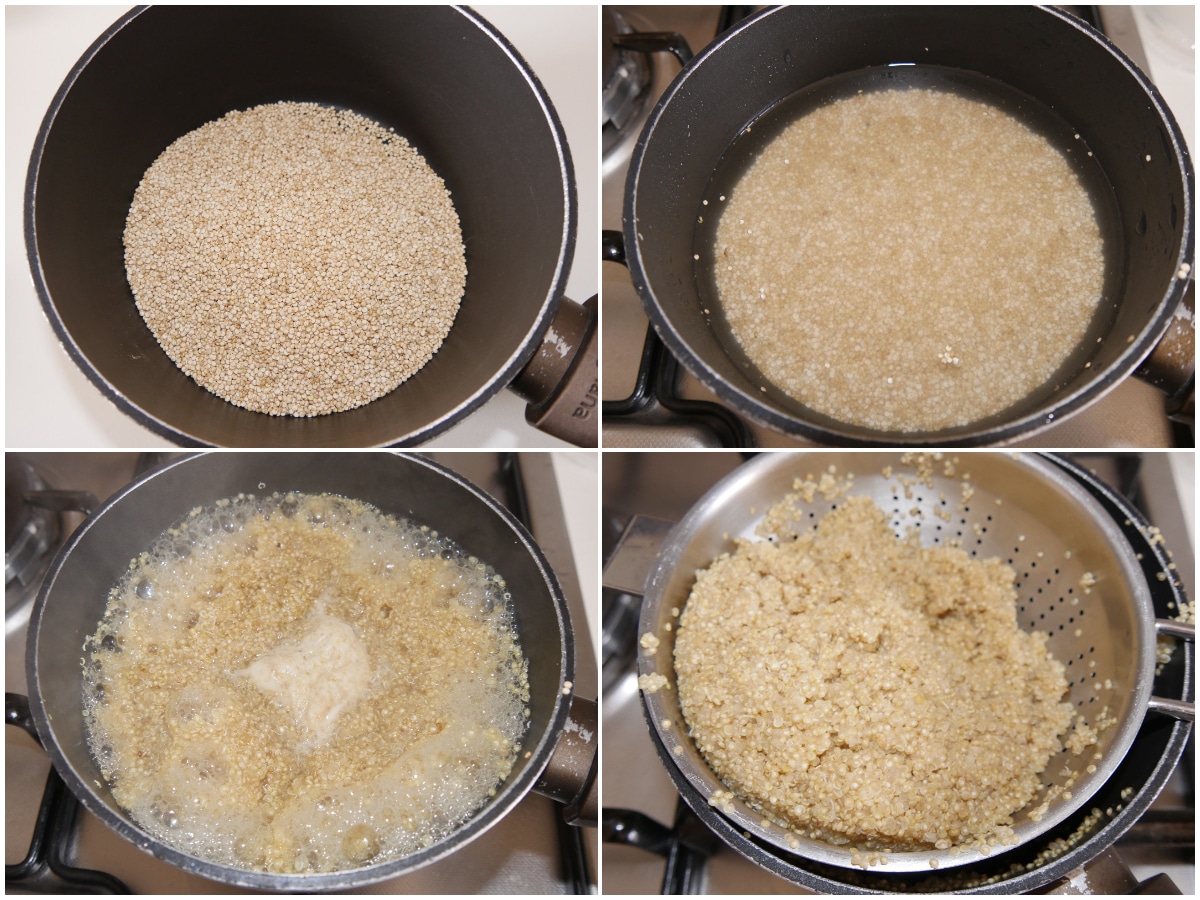Innanzitutto mettete la quinoa in un colino a maglie strette e sciacquatela molto molto bene sotto acqua corrente, in modo da eliminare tutte le saponine, che renderebbero i semini leggermente amari.