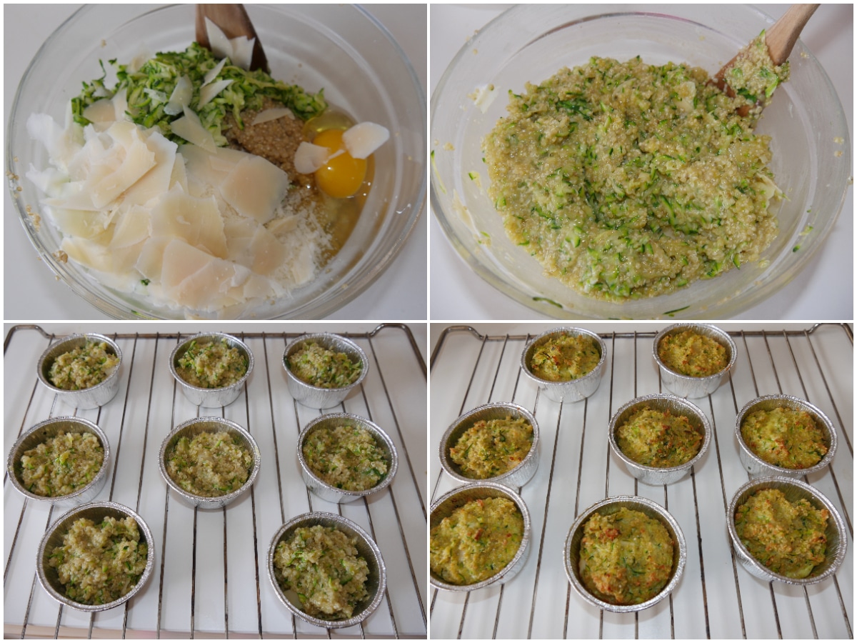 Mettete in una ciotola quinoa, zucchine, uova, formaggio a scagliette e sale (se serve) e mescolate, quindi distribuite il composto in formine da muffin (leggermente unte, se necessario) e cuocete per circa 20 minuti a 180°C in forno ventilato già caldo.