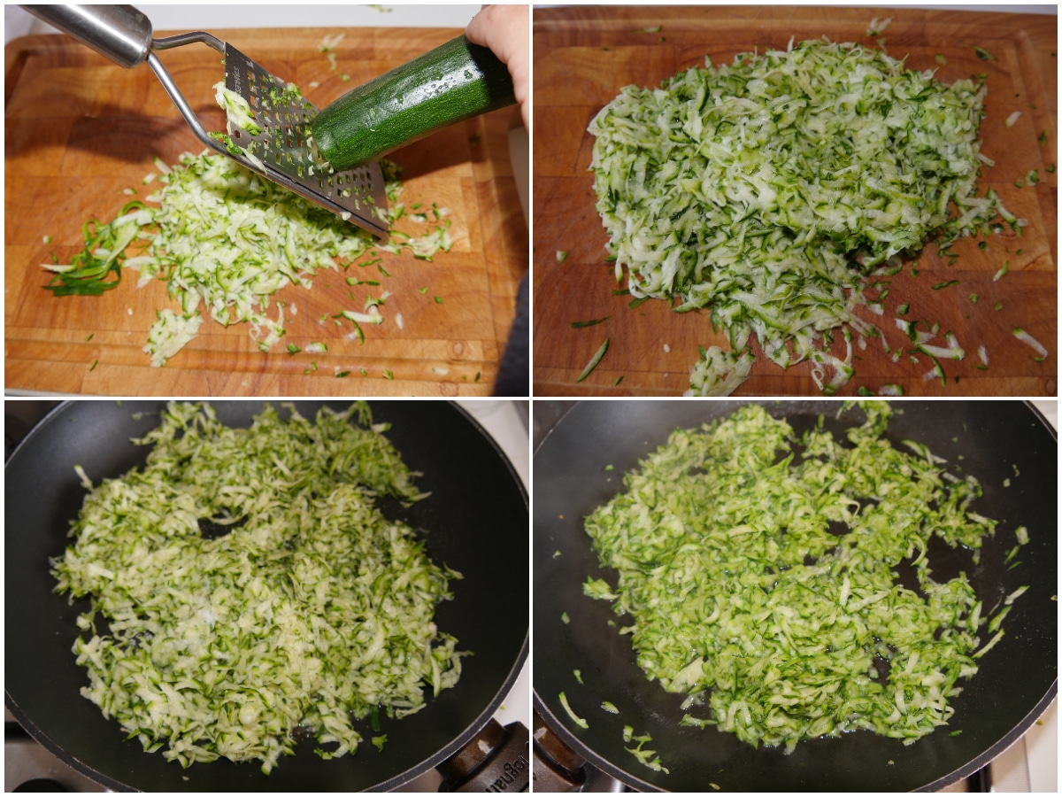 Mentre la quinoa cuoce, lavate e mondate le zucchine, quindi grattugiatele con una grattugia a fori larghi e cuocetele velocemente in padella con aglio, olio e sale, in modo da farle insaporire e far perdere un po' della loro acqua.