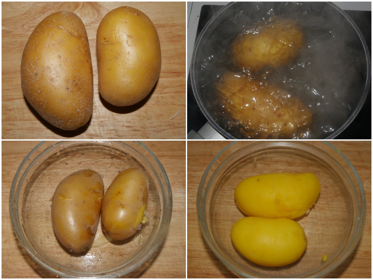 Innanzitutto lavate bene le patate, mettetele in una pentola con abbondante acqua fredda, portate ad ebollizione e lasciate bollire per 30 minuti o finché non saranno tenere (dipende dalle dimensioni delle patate), quindi scolatele e pelatele.
