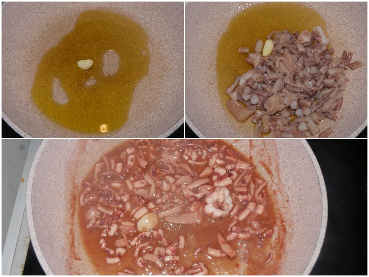 Fate saltare tentacoli e alette in padella con aglio e olio abbondante, cuocendo finché l'acqua rilasciata non si sarà asciugata.