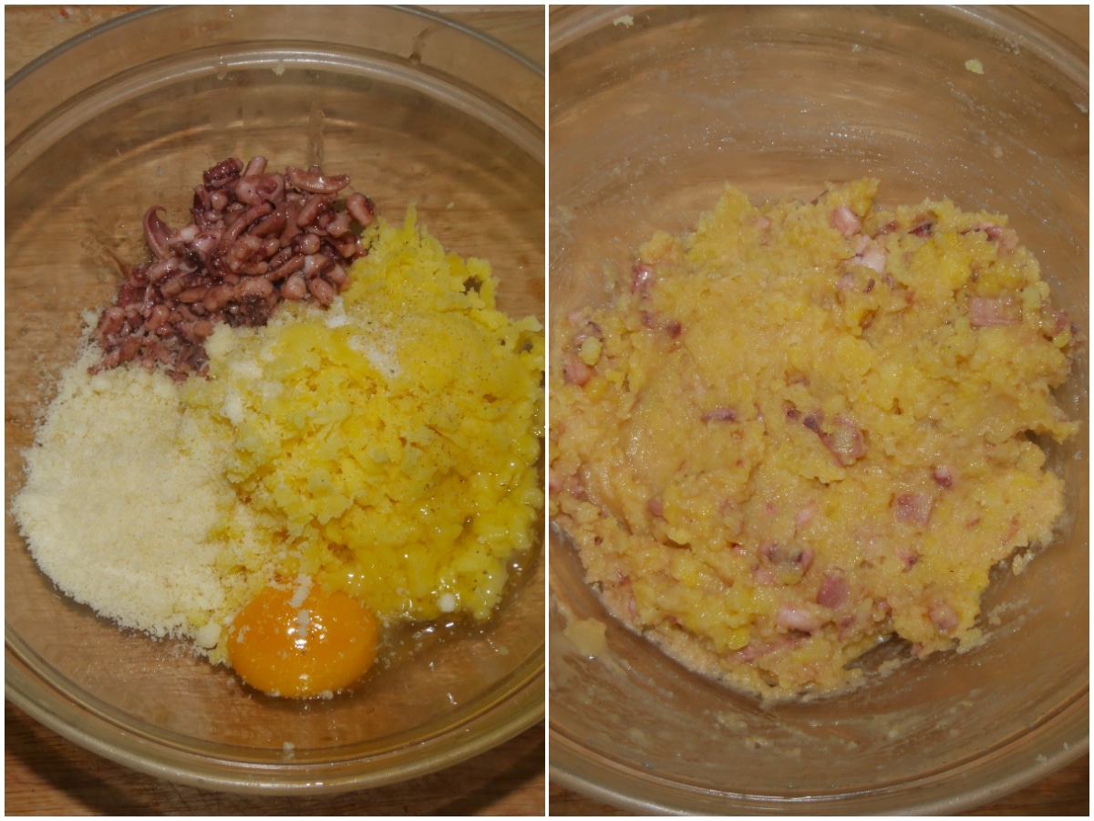 Lasciate ammollare il pane nel latte, poi strizzatelo e mettetelo in una ciotola con le patate schiacciate, uovo, parmigiano e il trito di totani, condite con sale e pepe e amalgamate.