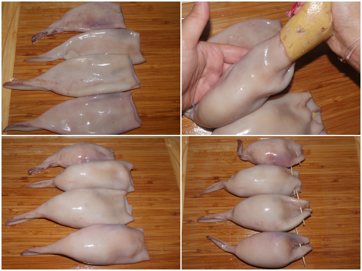 Con l'aiuto di una sac-à-poche (o di un cucchiaino) riempite le teste dei totani, senza arrivare fino al bordo, in modo da poterli chiudere con degli stuzzicadenti.