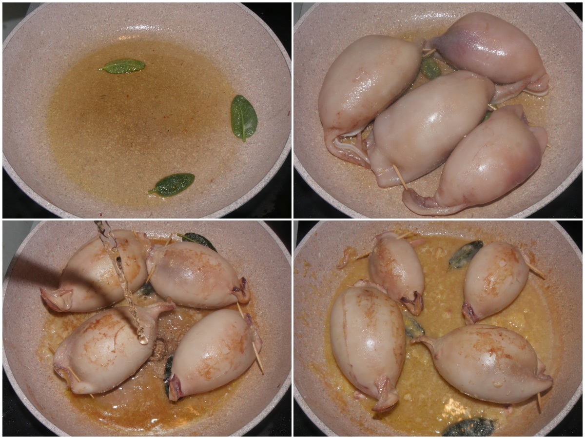 Fate rosolare i totani in padella con olio e salvia, girandoli per farli dorare in maniera uniforme, poi sfumate con il vino.