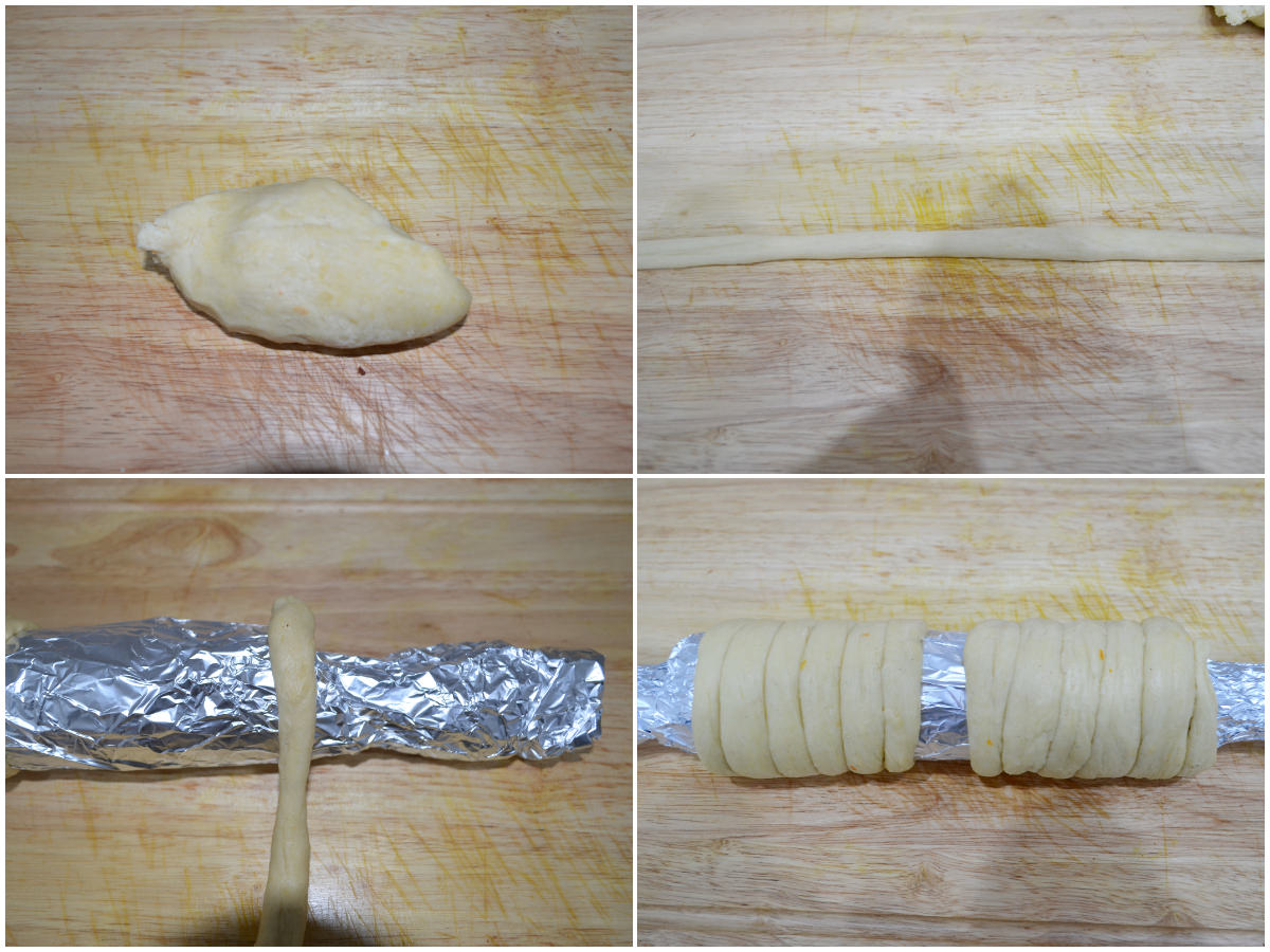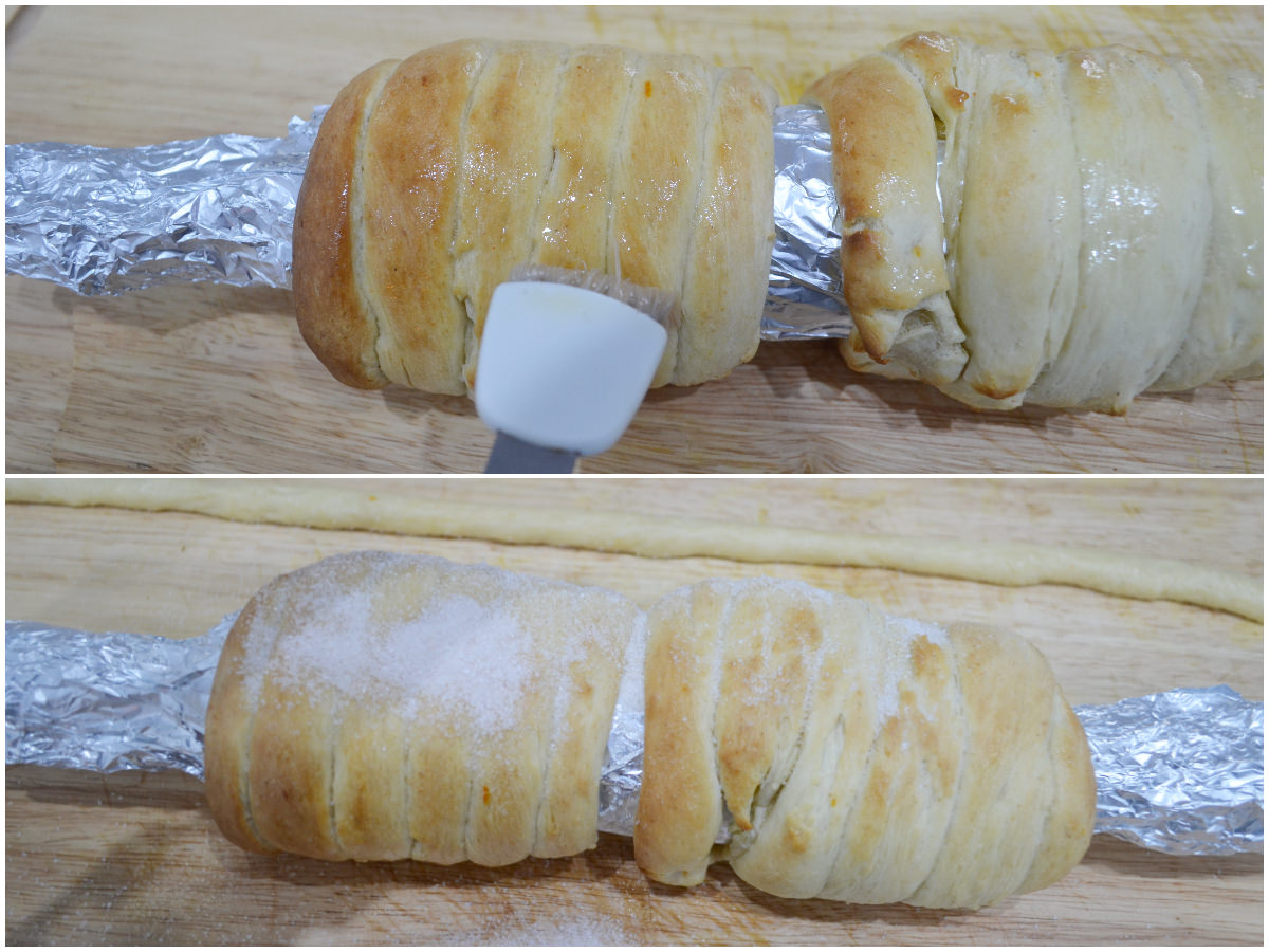 Rivestite un mattarello con carta di alluminio e avvolgete uno dei filoncini a spirale (attaccando ogni spirale alla precedente, in modo da formare alla fine una brioche unica) a una delle due estremità (prima del manico del mattarello).