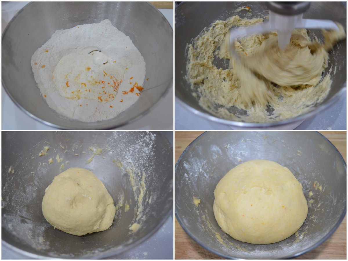 Versate farina, zucchero, lievito e buccia di arancia nella ciotola dell'impastatrice, quindi unite uovo, latte e burro e lavorate per almeno 10-15 minuti, finché l'impasto non si sarà incordato, staccandosi dalle pareti per arrampicarsi lungo il gancio.