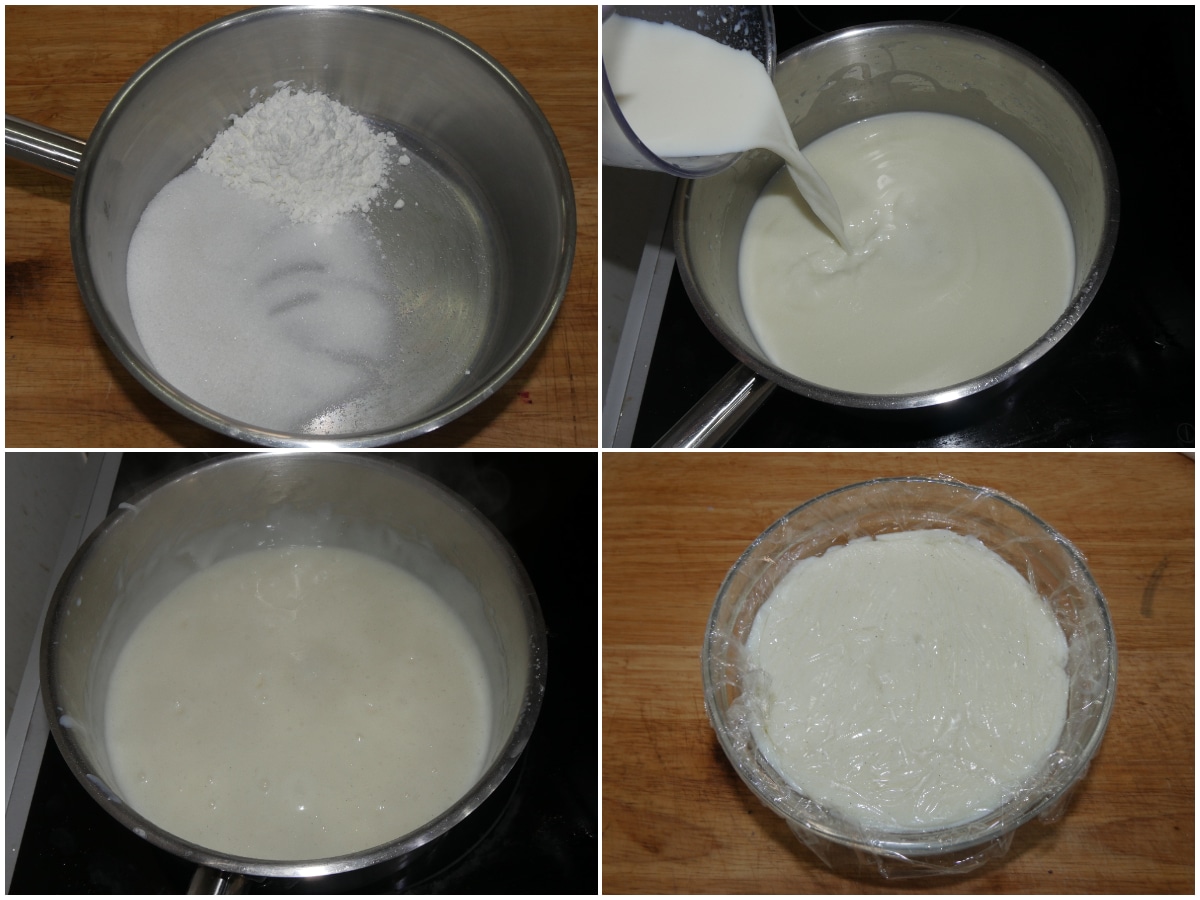 Innanzitutto preparate la crema al latte: unite farina, zucchero e vaniglia in una casseruola, quindi versateci sopra il latte bollente, infine rimettete sul fuoco e fate addensare per bene.