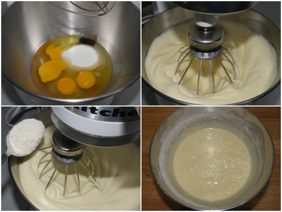 Preparate ora la pasta biscotto: montate le uova con zucchero e vaniglia per almeno 10 minuti, fino ad ottenere un composto chiaro e spumoso, quindi aggiungete la farina setacciata, un paio di cucchiai per volta, e infine anche la farina di mandorle.