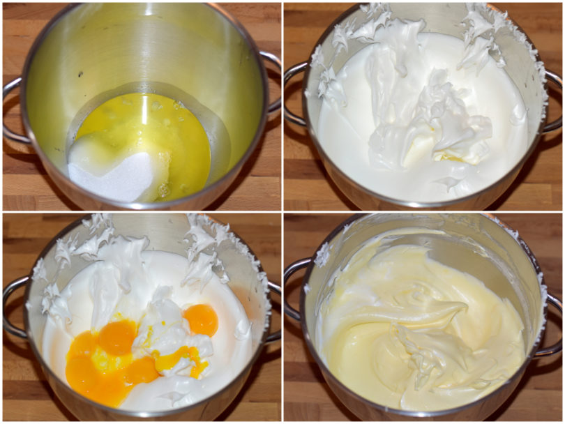 Innanzitutto preparate la pasta biscotto: montate gli albumi con lo zucchero fino ad ottenere una meringa soda, quindi incorporate i tuorli con una spatola, delicatamente.
