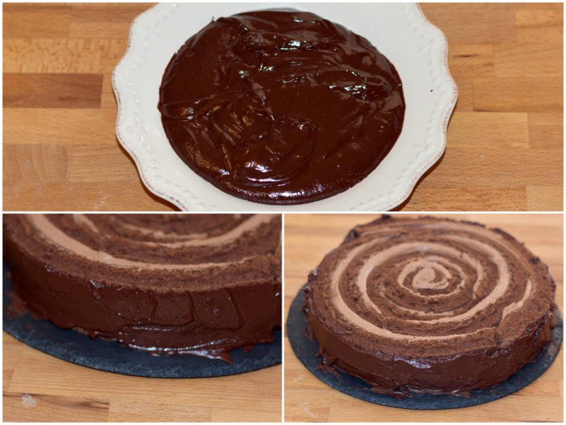 Decorate quindi i bordi della torta aiutandovi con una spatola: il risultato non dovrà essere liscio, ma irregolare, per ricordare la corteccia.