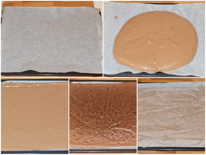 Trasferite il composto sulla teglia rivestita di carta forno, livellate bene e cuocete per circa 18-20 minuti in forno statico preriscaldato a 190°C, quindi sfornate, capovolgete su un secondo foglio di carta forno e lasciate raffreddare completamente, coperto da pellicola per alimenti (in modo da non far seccare l'impasto, che dovrà rimanere umido ed elastico).