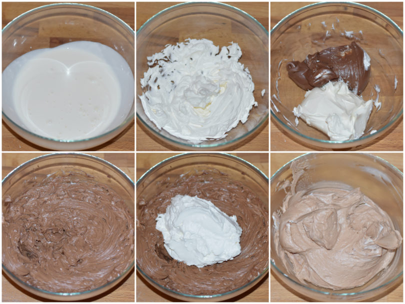 Preparate la crema di farcitura: montate la panna con le fruste; a parte, montate il mascarpone con la Nutella; infine, incorporate la panna al mascarpone, mescolando con un movimento dal basso verso l'alto per non farla smontare.