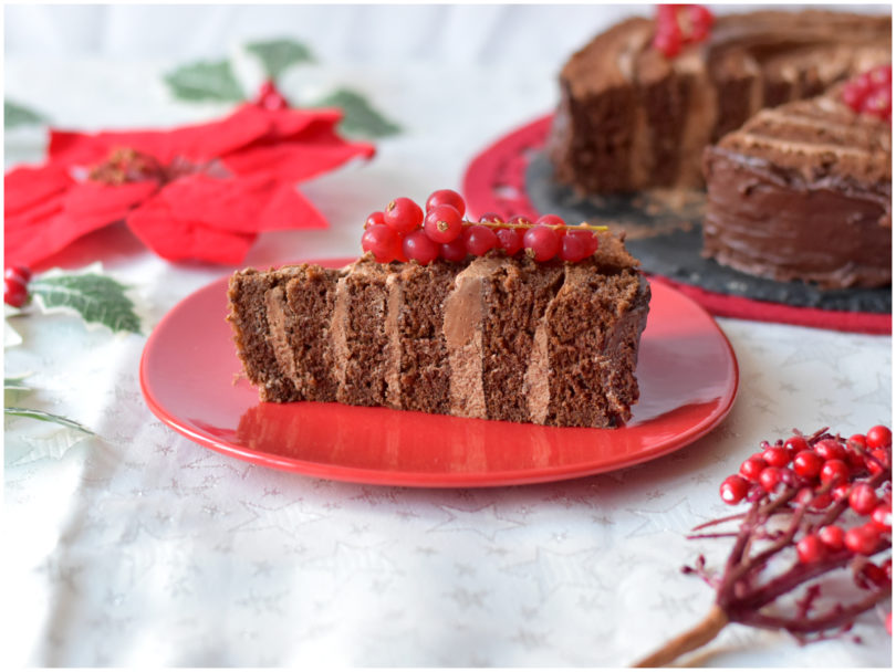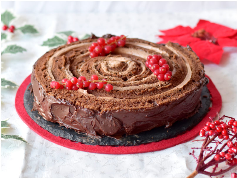 Il tronco di Natale è pronto, non vi resta che decorarlo con ribes fresco e servirlo.
