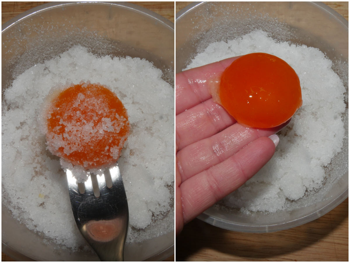 Una volta passati i tempi, estraete delicatamente (soprattutto se sono passate solo poche ore) il tuorlo e sciacquatelo in acqua fredda (per immersione, non sotto l'acqua corrente) per eliminare i residui di sale e zucchero.