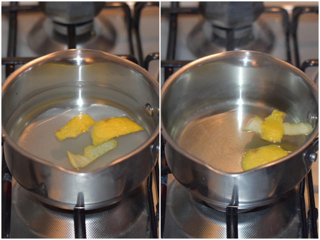 Preparate ora la bagna: mettete acqua, zucchero e buccia di limone in un pentolino, portate a ebollizione e lasciate cuocere per pochi minuti (finché lo zucchero non sarà completamente sciolto), quindi lasciate raffreddare e infine togliete la buccia.
