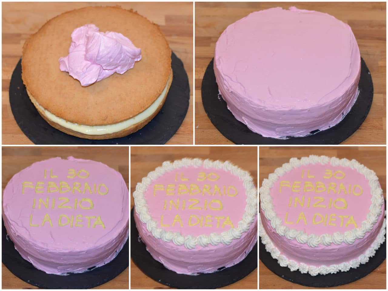 Ricoprite interamente con il frosting rosa, livellando la superficie con una spatola, poi create la scritta con il frosting giallo (aiutandovi con una sac-à-poche con il beccuccio liscio e sottile) e infine create i ciuffetti decorativi con il frosting bianco (con una sac-à-poche dal beccuccio a stella).
