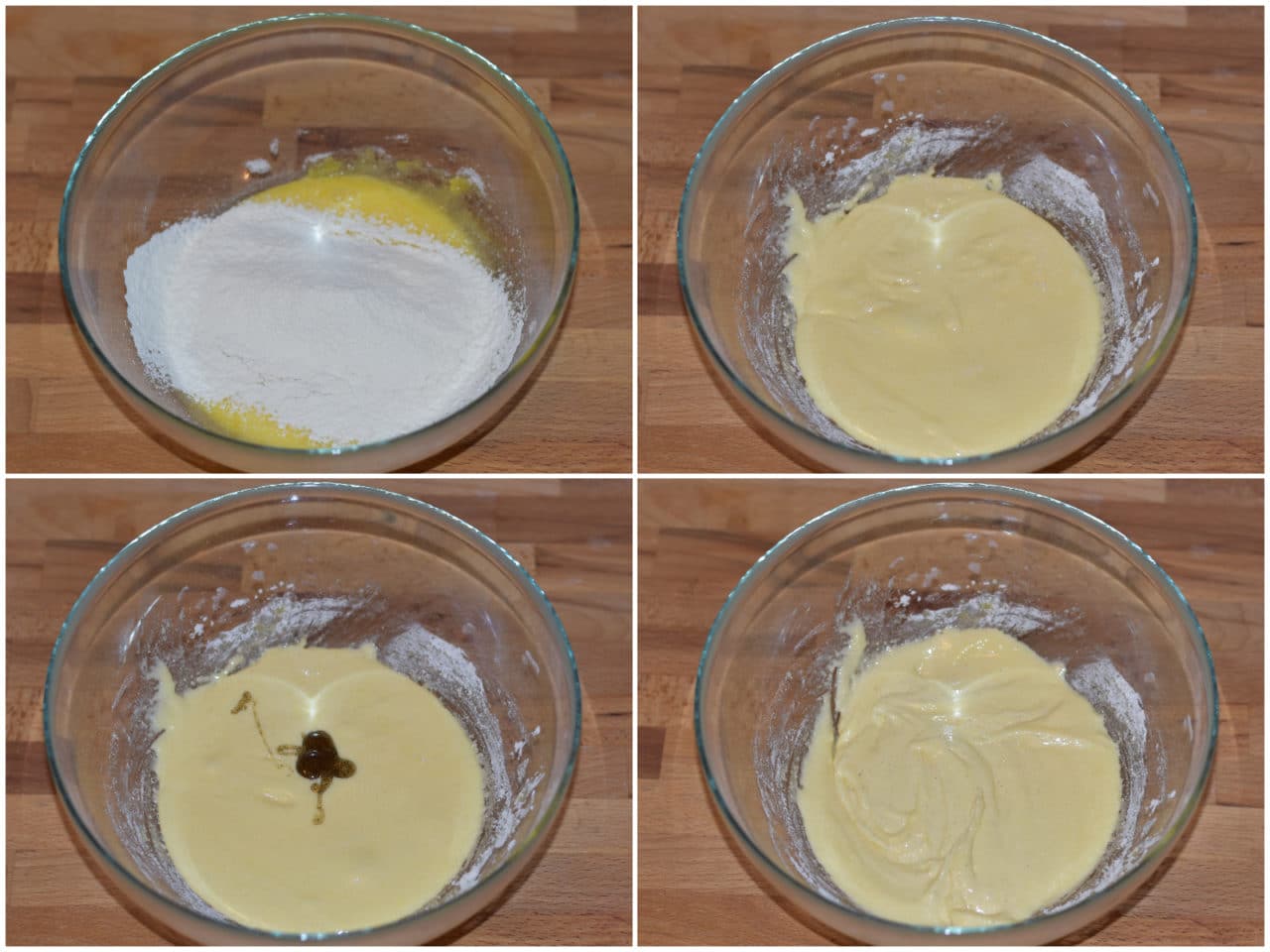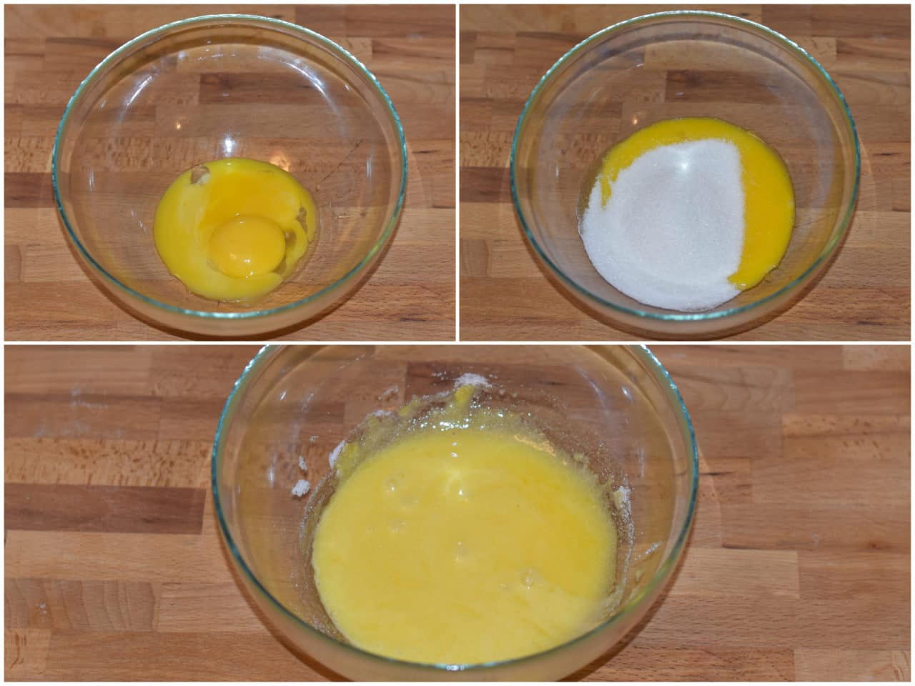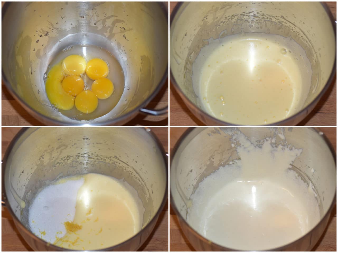 Montate i tuorli con l'acqua bollente, poi unite zucchero e buccia di limone grattugiata, sempre continuando a montare.