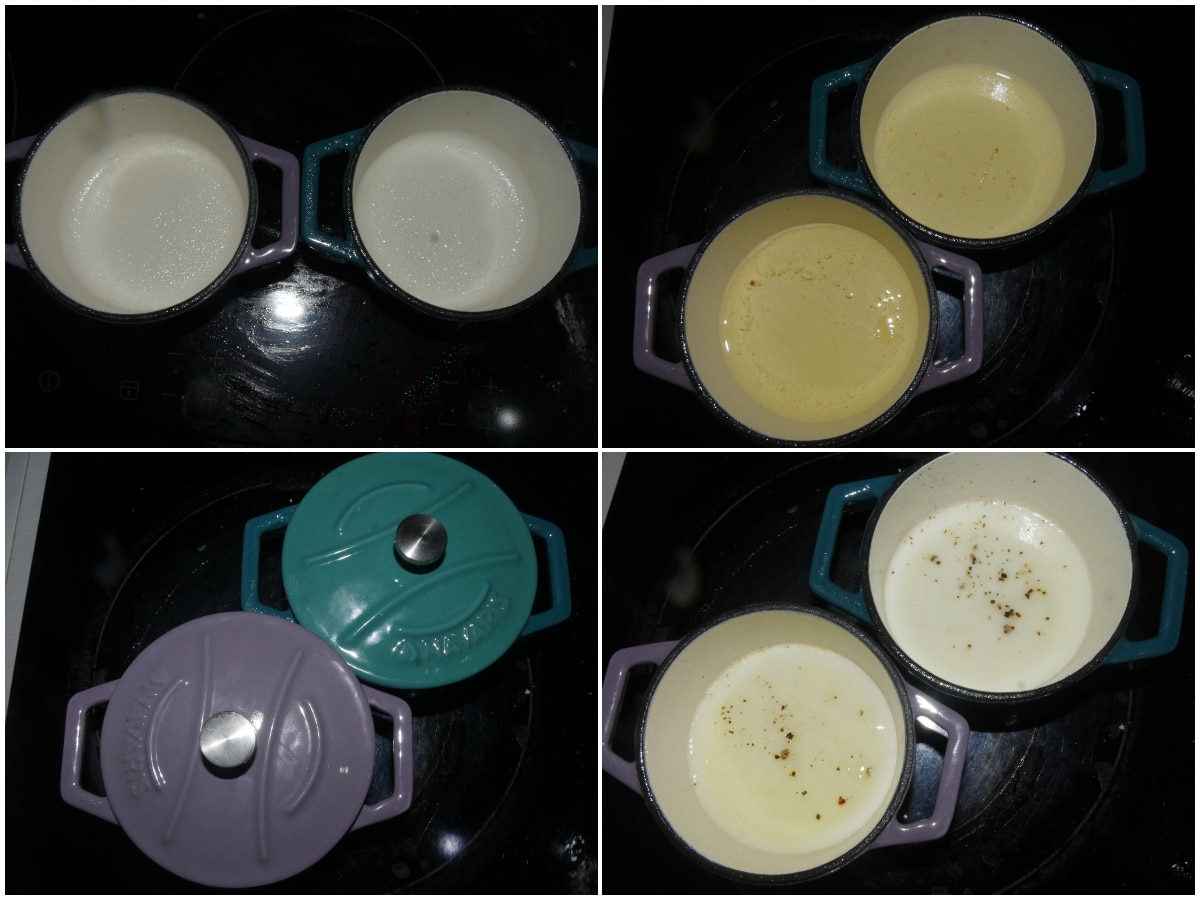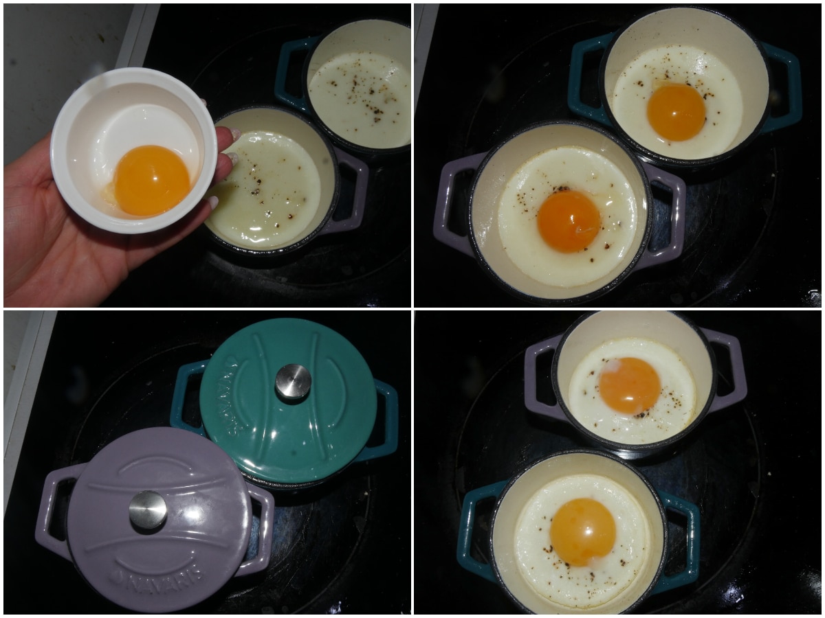 Fate sciogliere il burro (ma potete usare anche dell'olio di oliva, dipende dal vostro gusto personale e da cosa avete a casa) nella padella (o nei tegamini, nel mio caso) e fatelo scaldare, quindi aggiungete gli albumi, condite con sale e pepe e cuocete con il coperchio.