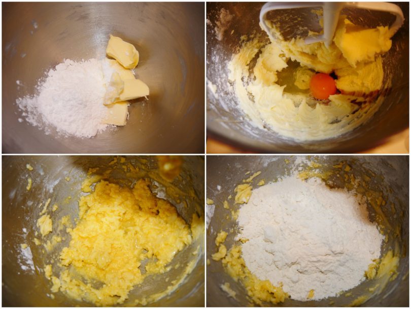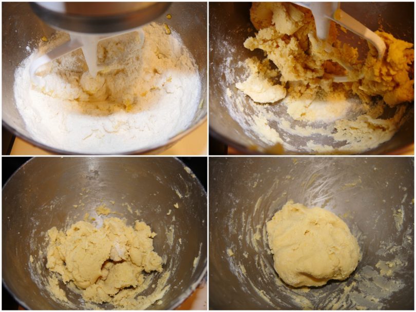 Preparate la pasta frolla: lavorate burro e zucchero fino ad ottenere una consistenza a pomata, poi incorporate uovo e aromi e infine anche le farine.