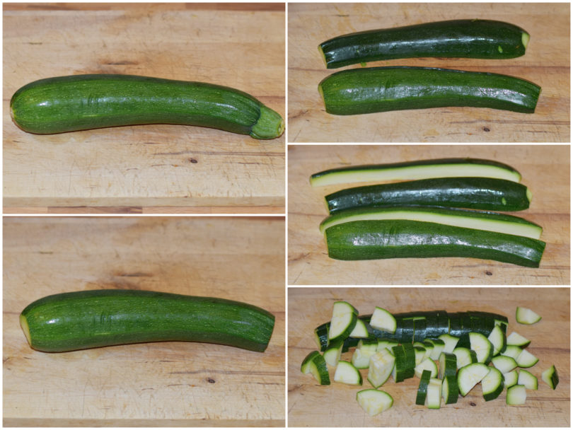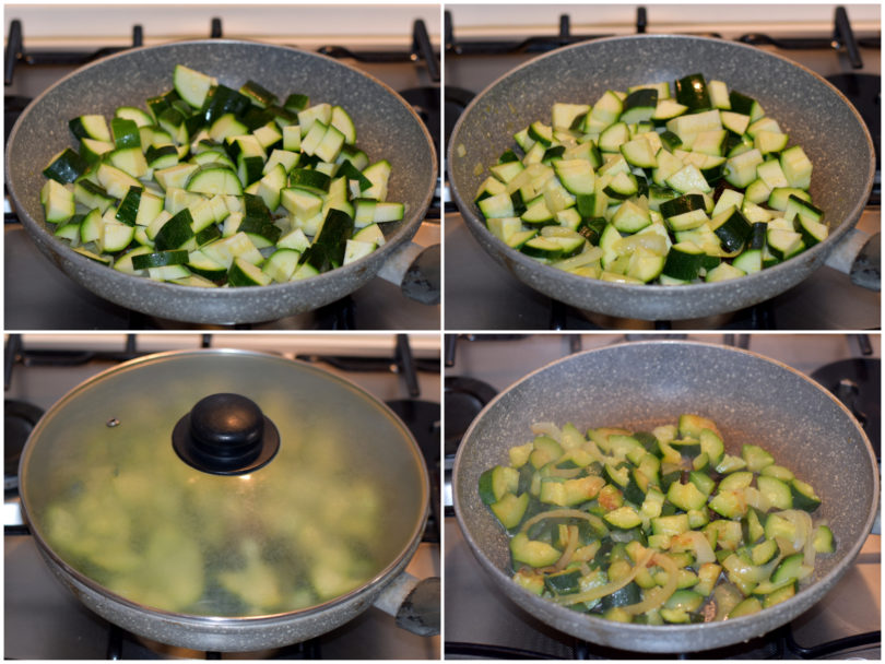 Nel frattempo mondate anche le zucchine e tagliatele a tocchetti, quindi unitele alla cipolla e lasciate insaporire per un paio di minuti, poi unite l'acqua e cuocete con coperchio per circa 15 minuti.