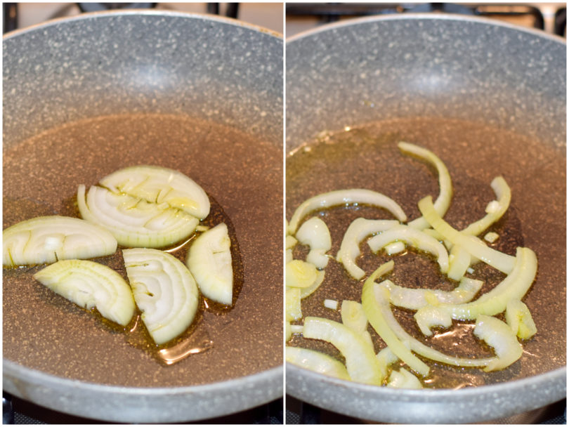 Innanzitutto mondate la cipolla, tagliatela a fettine e lasciatela appassire leggermente in padella antiaderente con olio.