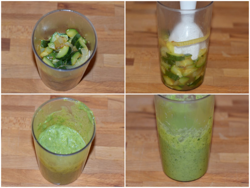 Una volta cotte aggiustate di sale, poi frullate le zucchine con tutto il loro fondo di cottura fino ad ottenere una crema liscia (potete usare un mixer o un minipimer).