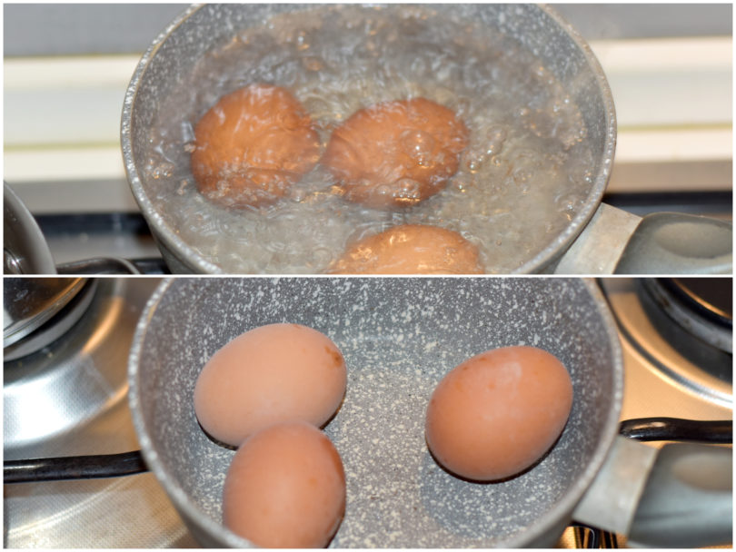 Intanto che gli spinaci raffreddano occupatevi delle uova: mettetele in un pentolino, ben coperte con acqua fredda, e lasciate cuocere per 8-10 minuti dall'ebollizione, poi scolatele.