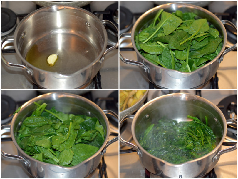 Innanzitutto scaldate in una casseruola un filo d'olio con l'aglio, poi aggiungete gli spinaci (già mondati), 3-4 cucchiai di acqua e un pizzico di sale e cuocete finché l'acqua non sarà stata tutta assorbita o evaporata.