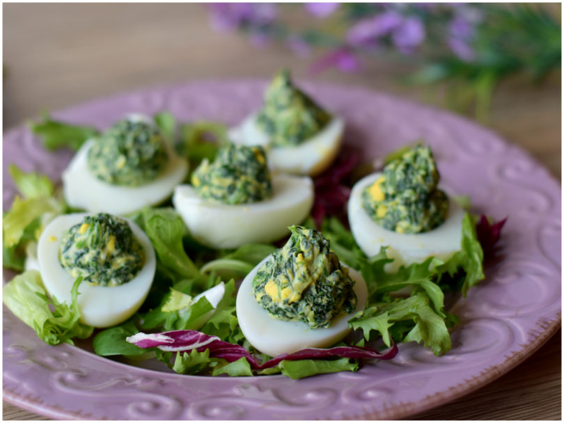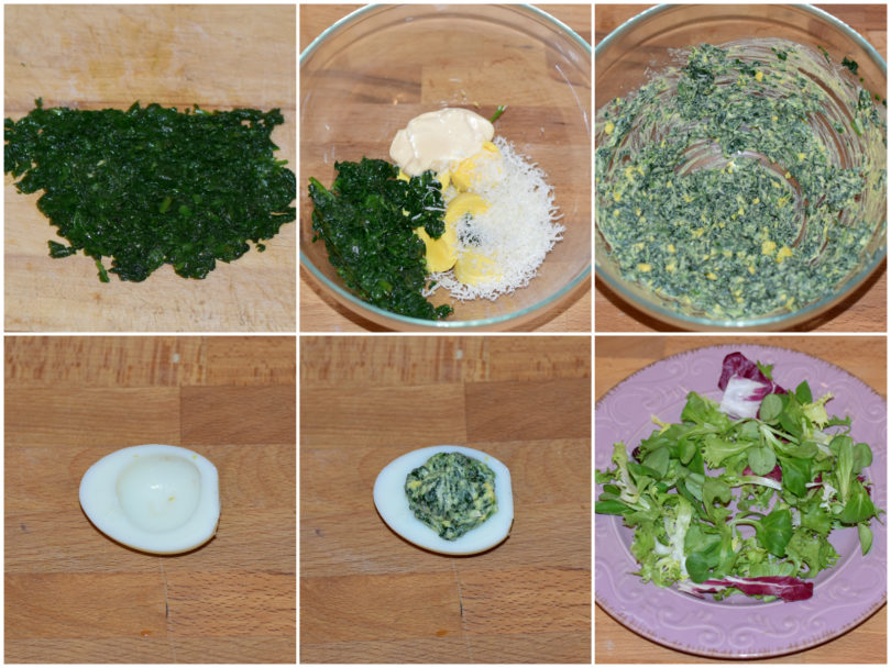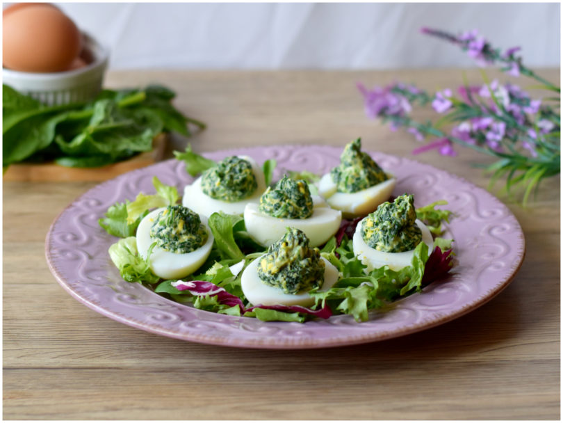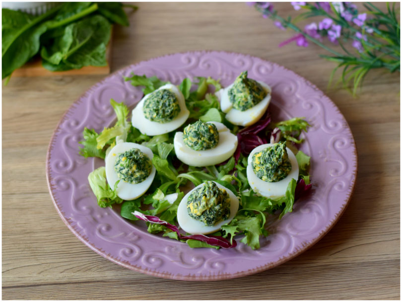 Le uova ripiene di spinaci sono pronte, non vi resta che servirle, su di un bel letto di insalata.