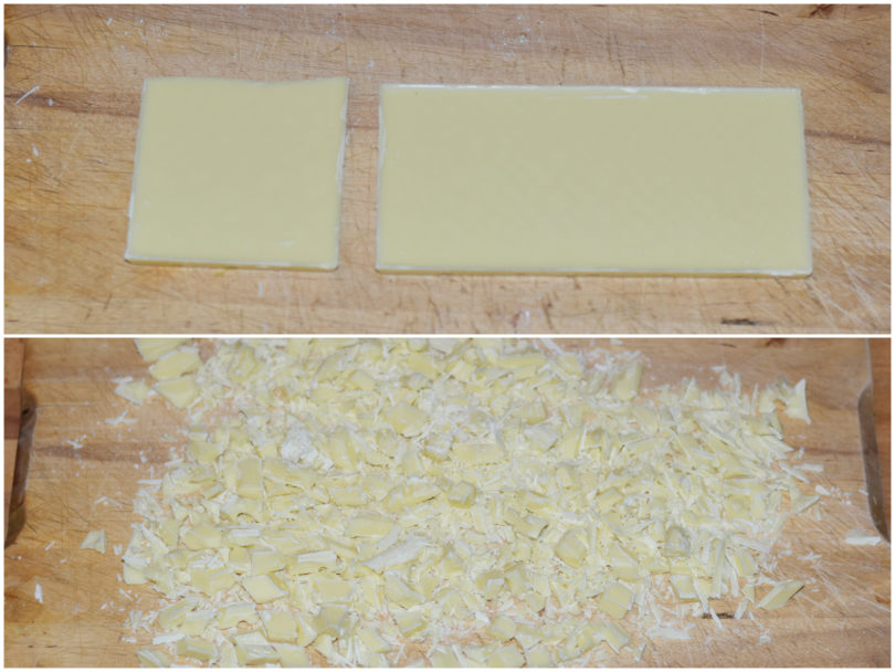 Tritate grossolanamente il cioccolato bianco e scioglietelo a bagnomaria.
