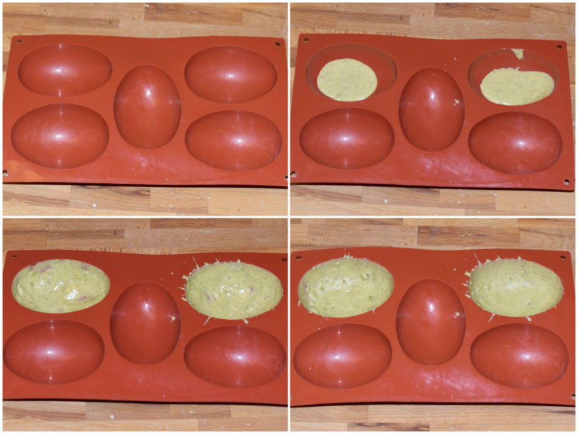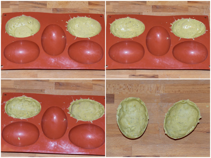 Distribuite all'interno dei 2 stampini a forma di mezzo uovo, rivestendo l'intera superficie, poi lasciate riposare in frigo per almeno 15 minuti.