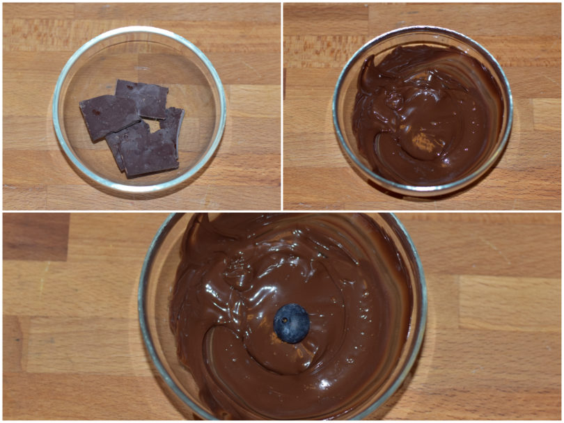Prendete un mirtillo per volta, intingetelo nel cioccolato sciolto e poggiatelo su di un vassoio rivestito di carta forno.