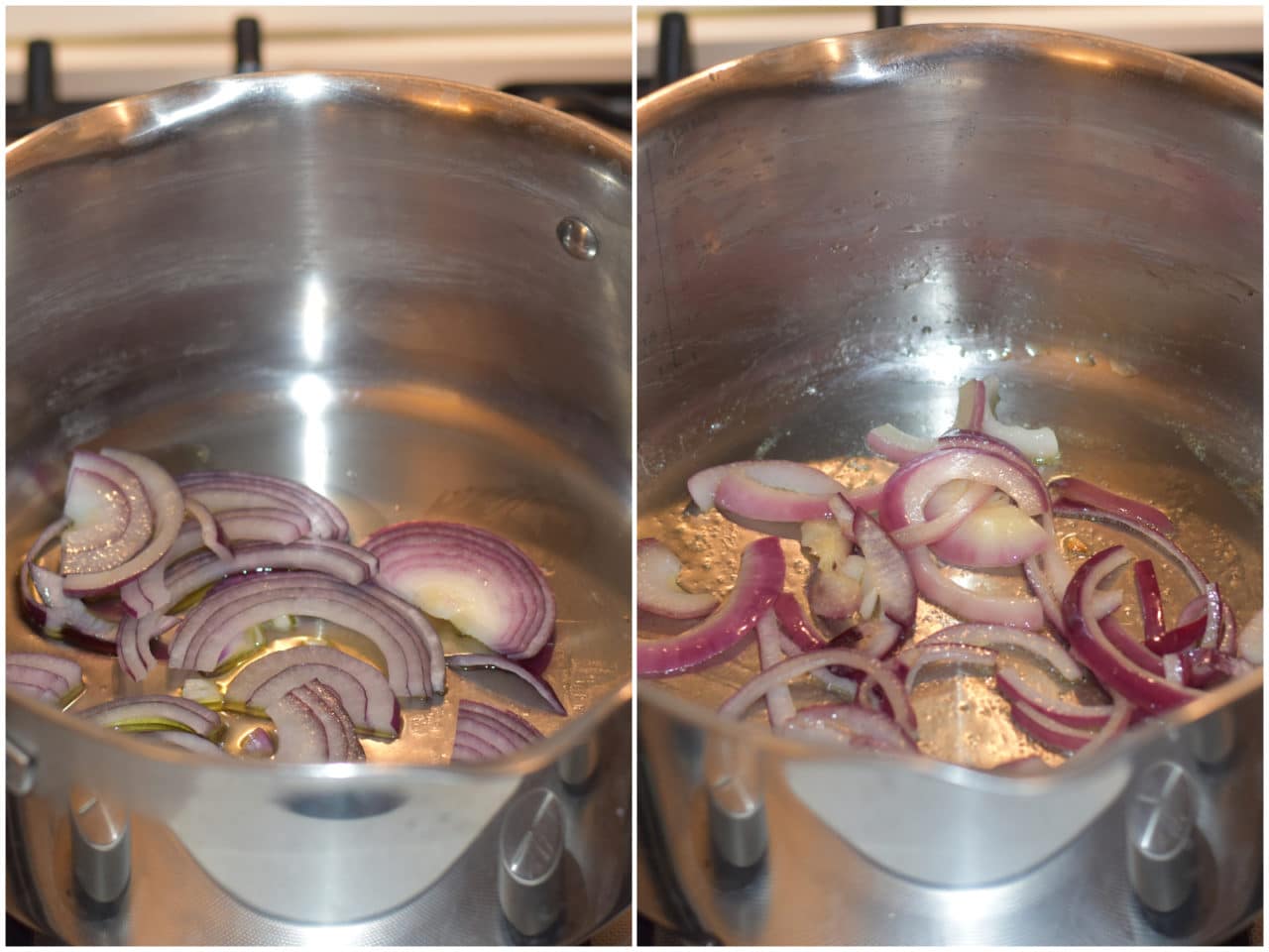 Mondate anche la cipolla, tagliatela a fettine sottili e fatela appassire con olio in una casseruola abbondante.