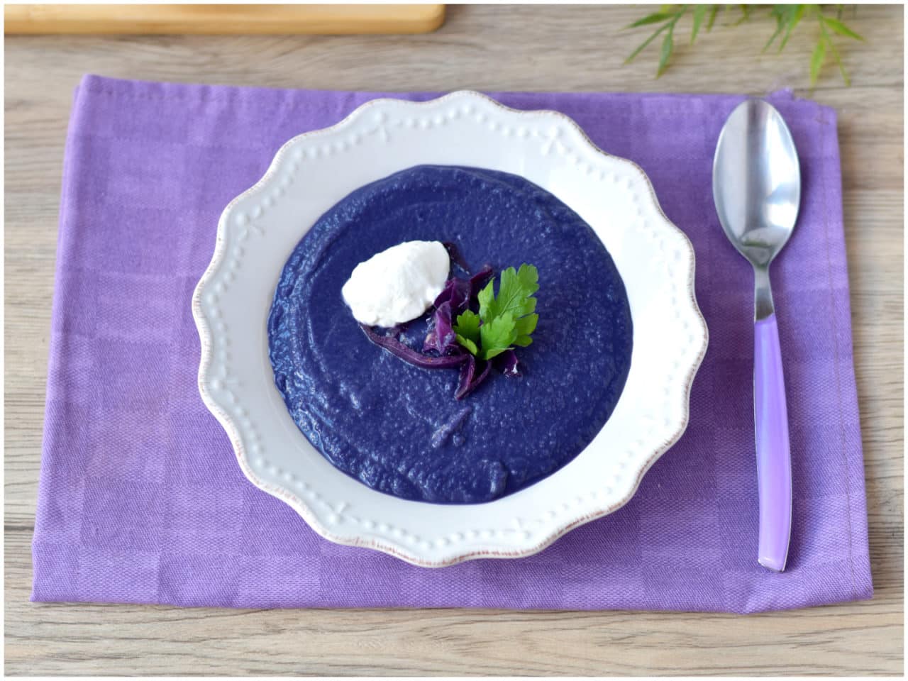 La vellutata di cavolo rosso è pronta, non vi resta che impiattare, decorare con prezzemolo e panna acida e servire.
