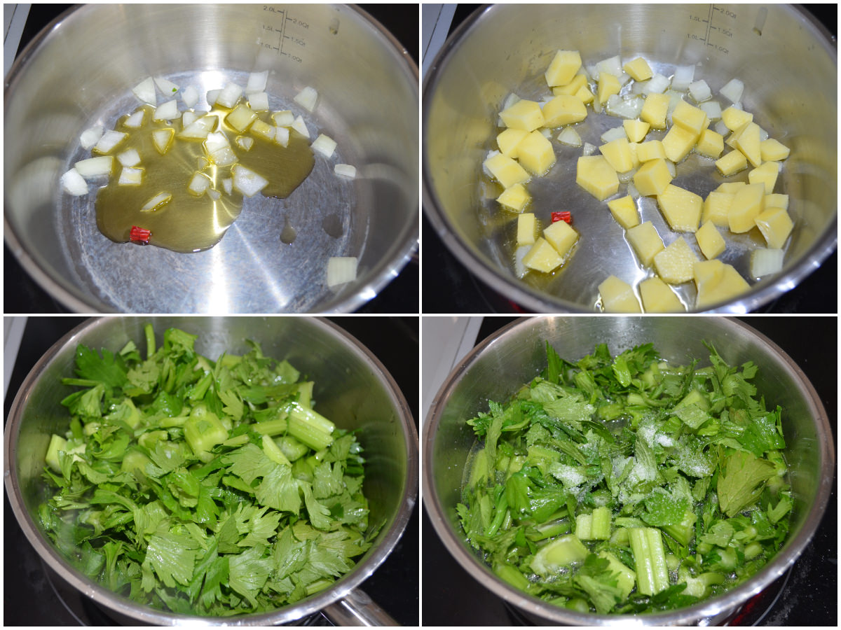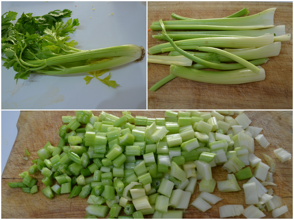 Innanzitutto lavate bene il sedano sotto acqua corrente, quindi pulitelo eliminando le basi e le parti rovinate e infine tirate via i fili delle coste più grosse e tagliatelo a pezzetti, foglie comprese.