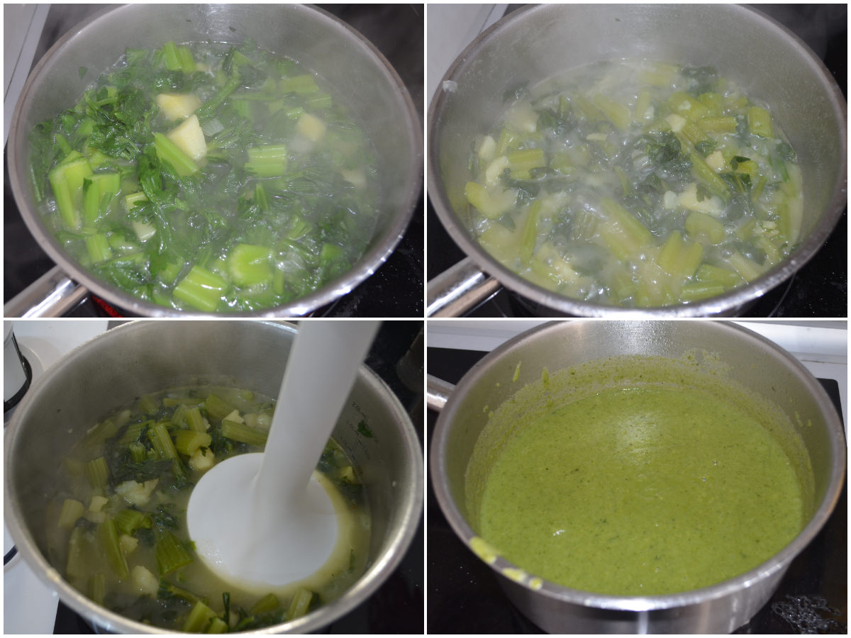 Fate cuocere finché patate e sedano non saranno ben morbidi (circa 20 minuti, ma dipende dalle dimensioni dei tocchetti), quindi frullate tutto con il minipimer fino ad ottenere una crema liscia.