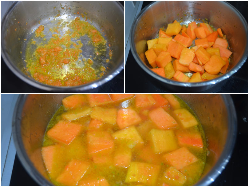 Soffriggete gli odori (cipolla, sedano e carota) tritati con un po' di olio, quindi unite la zucca e lasciatela insaporire.