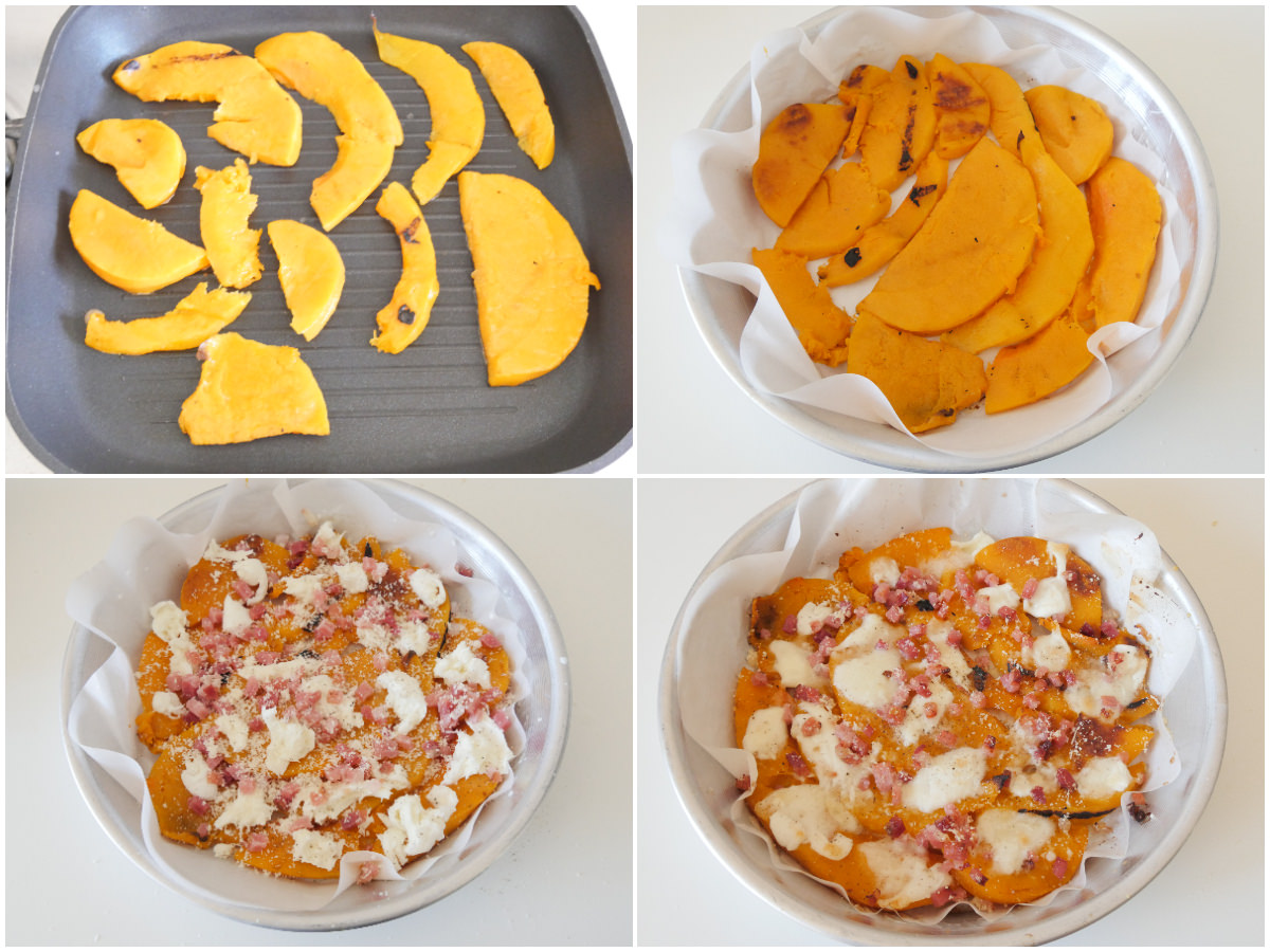 Arrostite quindi la zucca su una piastra o bistecchiera ben calda, giusto il tempo di farla colorire con le caratteristiche righe della griglia, quindi sistematela in una teglia rivestita di carta forno, cospargetela con speck a dadini, mozzarella a pezzetti, sale, olio e parmigiano, e cuocete per circa 10 minuti in forno ventilato preriscaldato a 180°C.