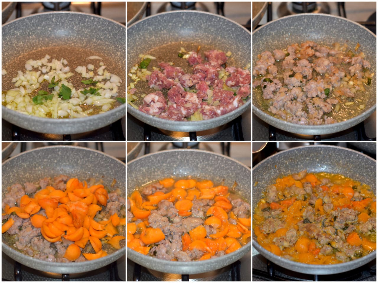 Nel frattempo tritate grossolanamente la cipolla, spezzettate la salvia e fatele appassire in un'ampia padella antiaderente con dell'olio, poi aggiungete la salsiccia sbriciolata e lasciatela rosolare, infine unite anche la polpa di zucca a pezzetti e 100 ml di acqua e lasciate stufare a fiamma medio-bassa per almeno 15 minuti.