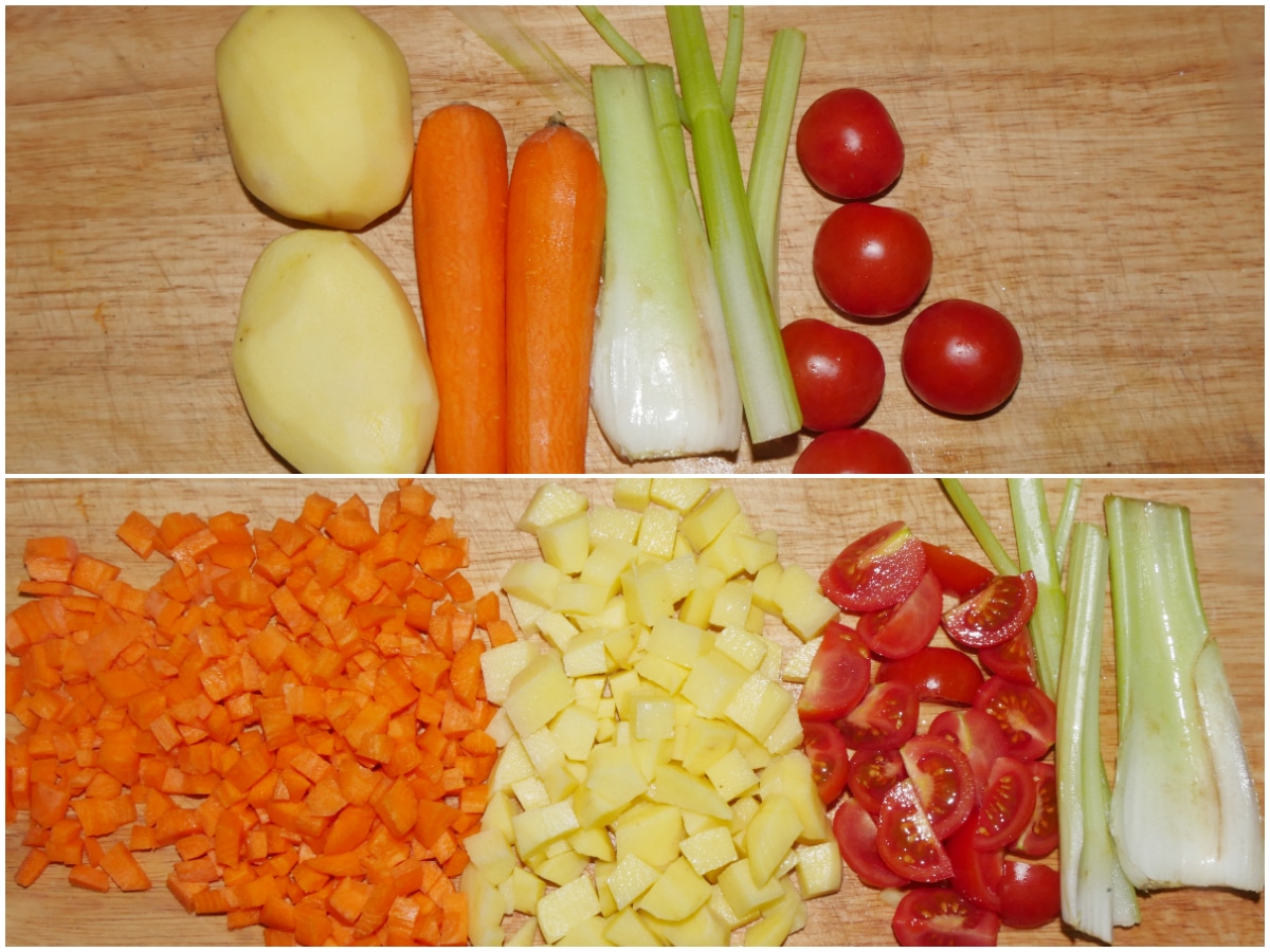 Nel frattempo mondate gli ortaggi e tagliateli a cubetti (io lascio il sedano intero perché di solito lo elimino a fine cottura).