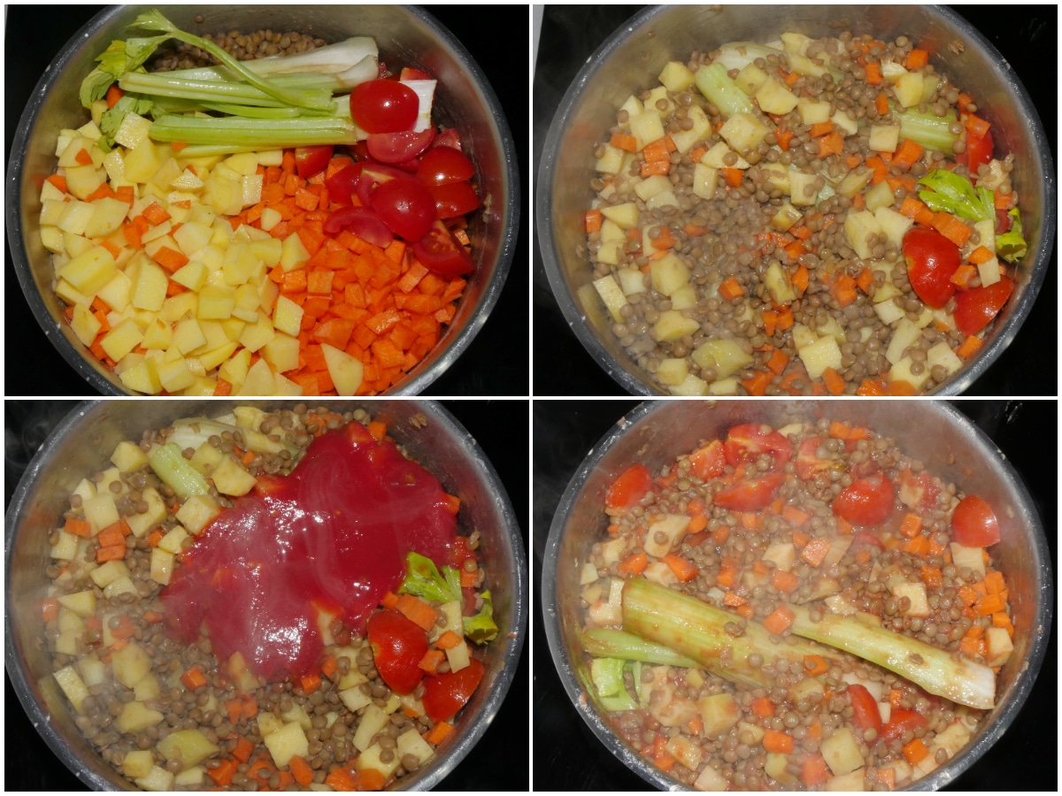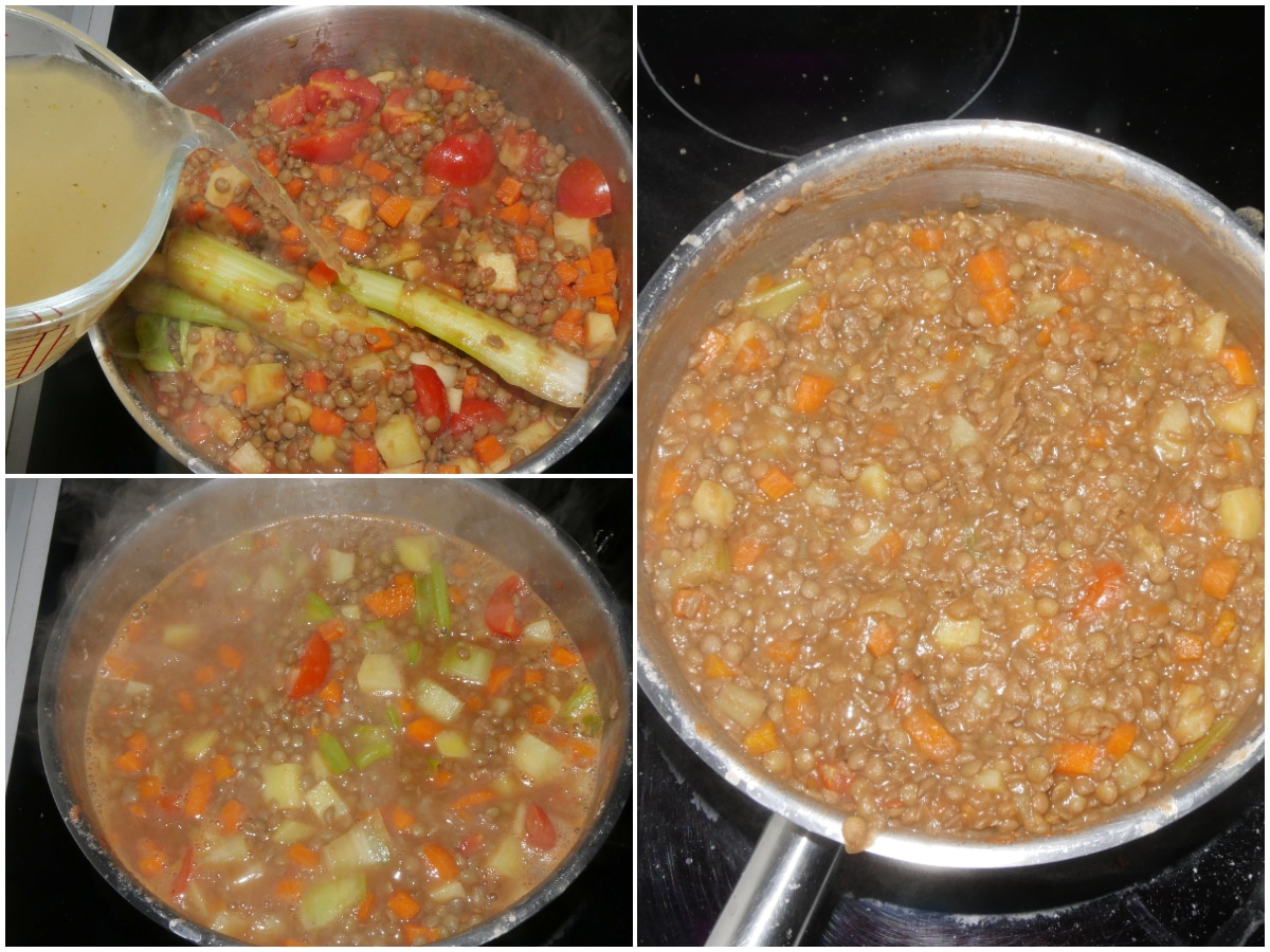 Uniteli alle lenticchie insieme con la passata e cuocete per almeno 30 minuti o finché tutti gli ingredienti non risulteranno ben cotti, aggiungendo altro brodo caldo se serve, infine aggiustate di sale e condite con olio a piacere.