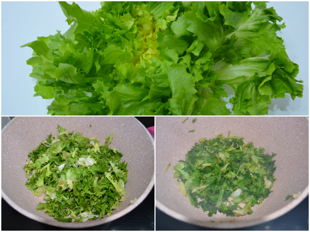 Pulite le scarole, lavatele bene, spezzettatele e fatele appassire per 5-10 minuti in padella con sale e olio.
